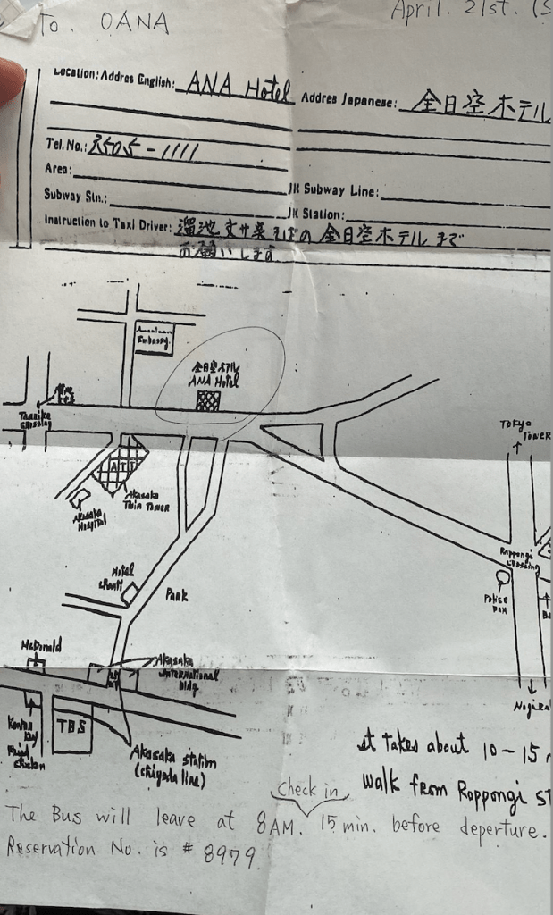 I pull out the papers faxed by the agency in Tokyo, papers that simulated a hand-drawn map. What is clear is that I need to get to this Ana Hotel and then call the agency. It’s 11:00 PM, and the paper specifies some hours that seem to be in the morning, I start feeling a bit nauseous…